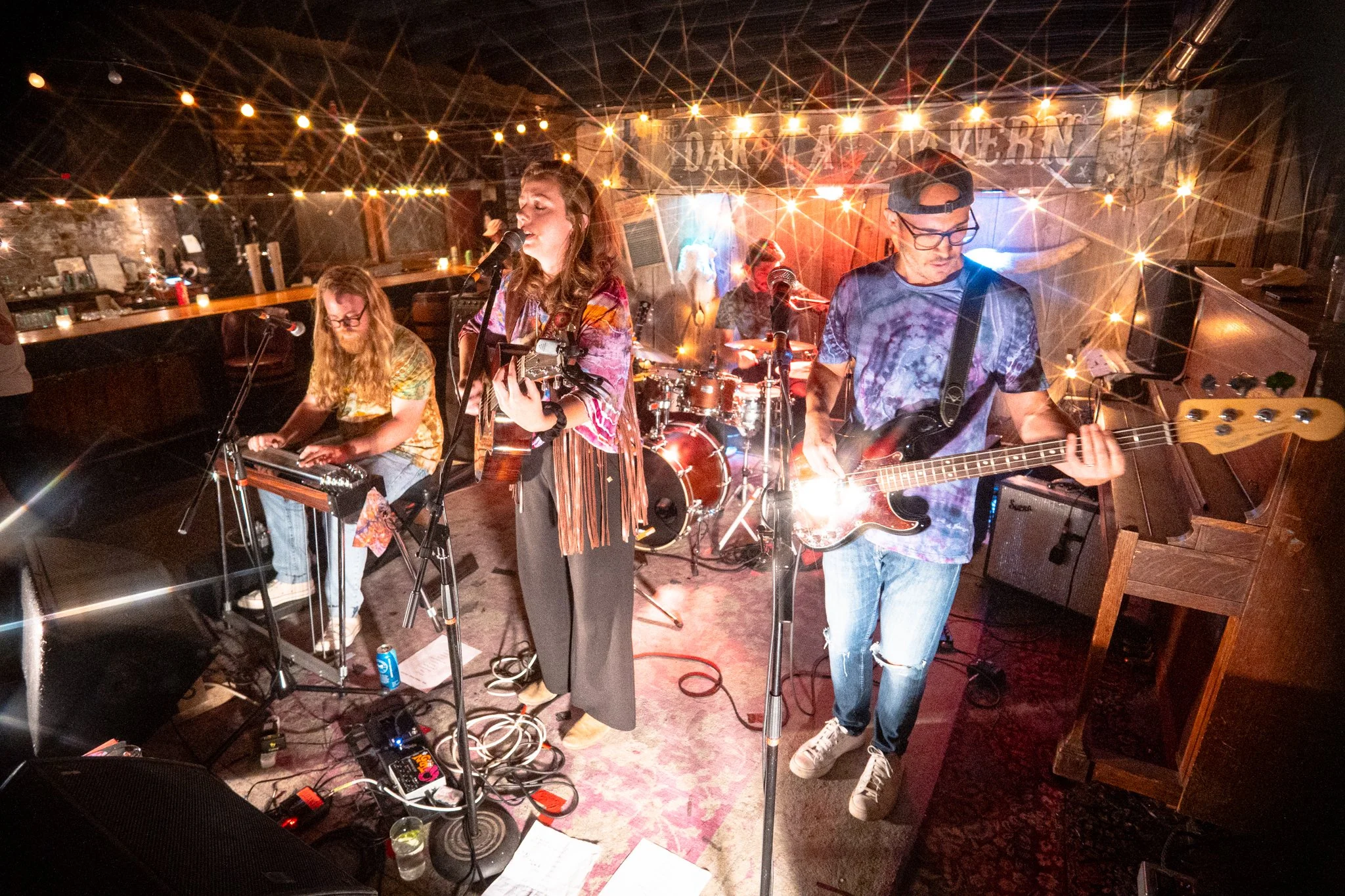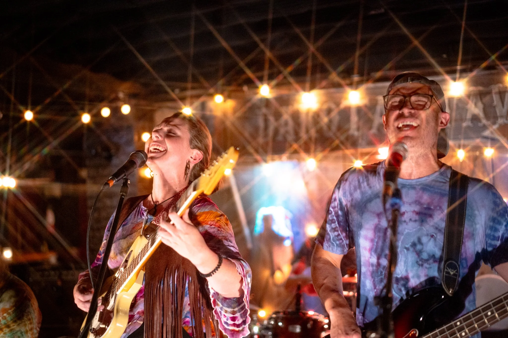 A band performs live on stage in a dimly lit venue with string lights overhead. The band includes a woman singing and playing guitar, a woman on keyboard, a man playing bass guitar, and a drummer in the background.