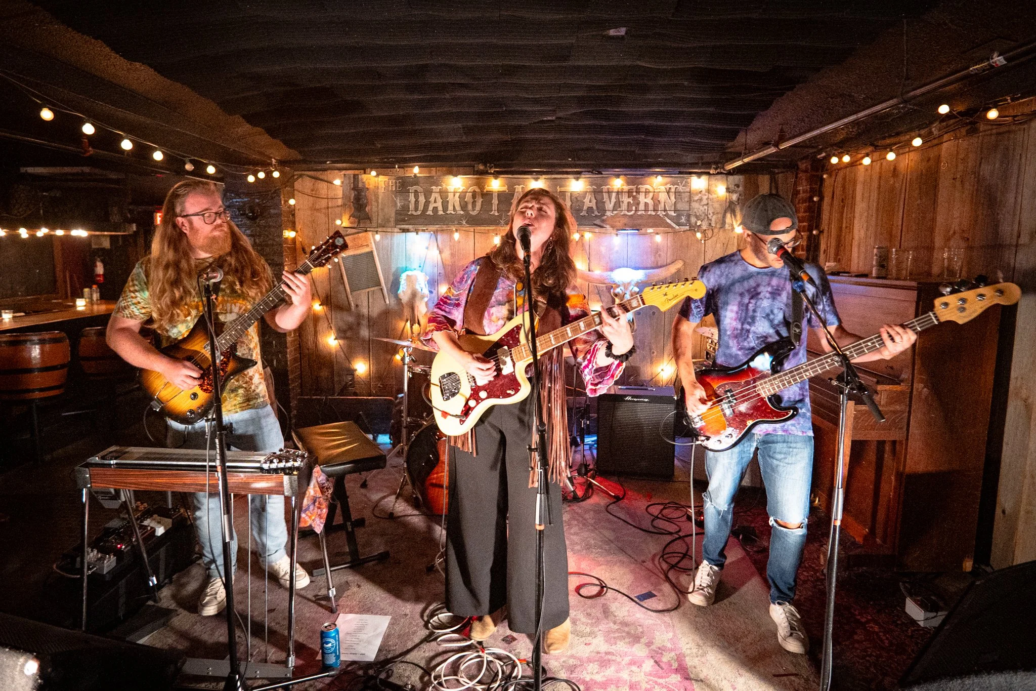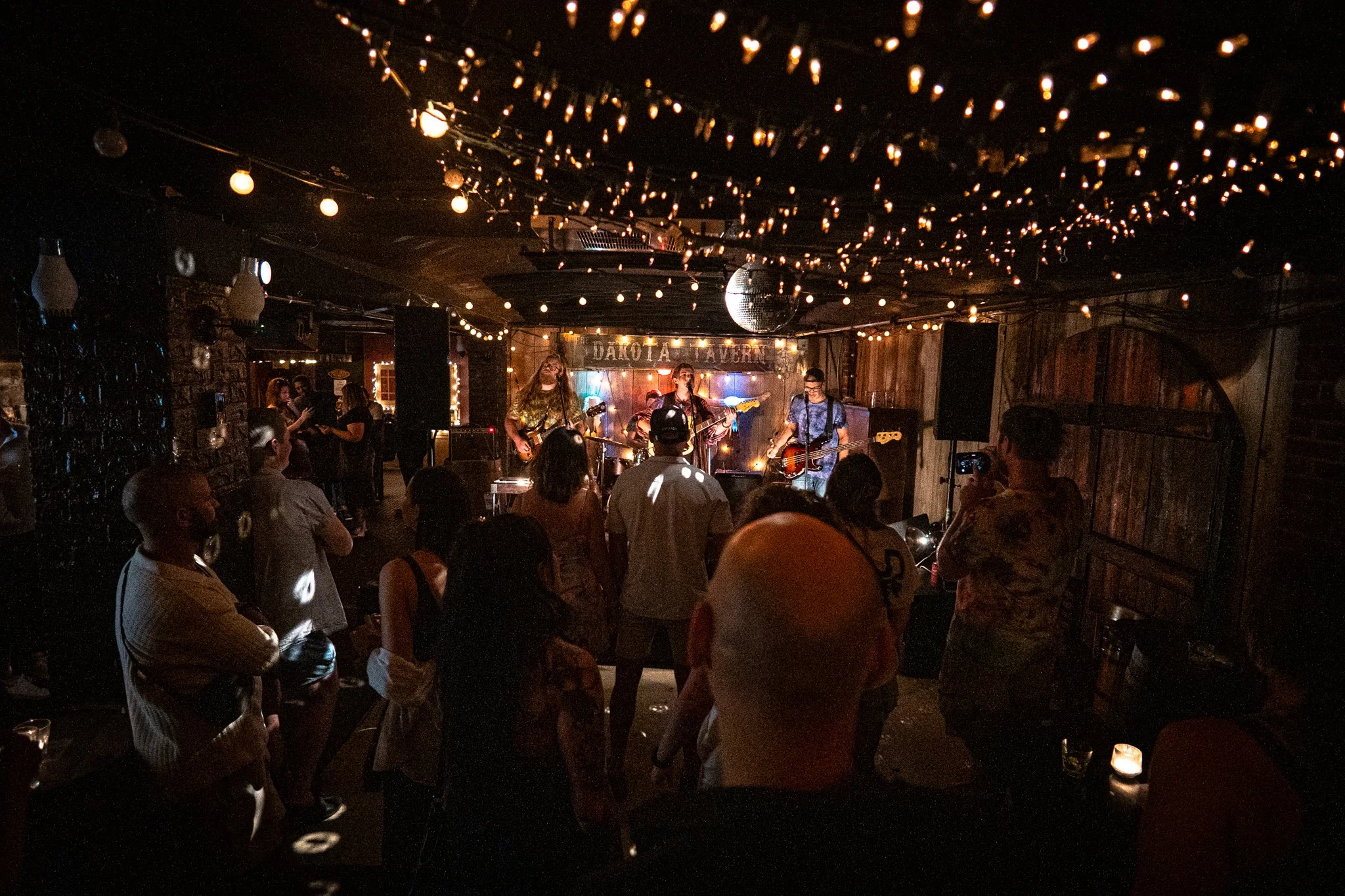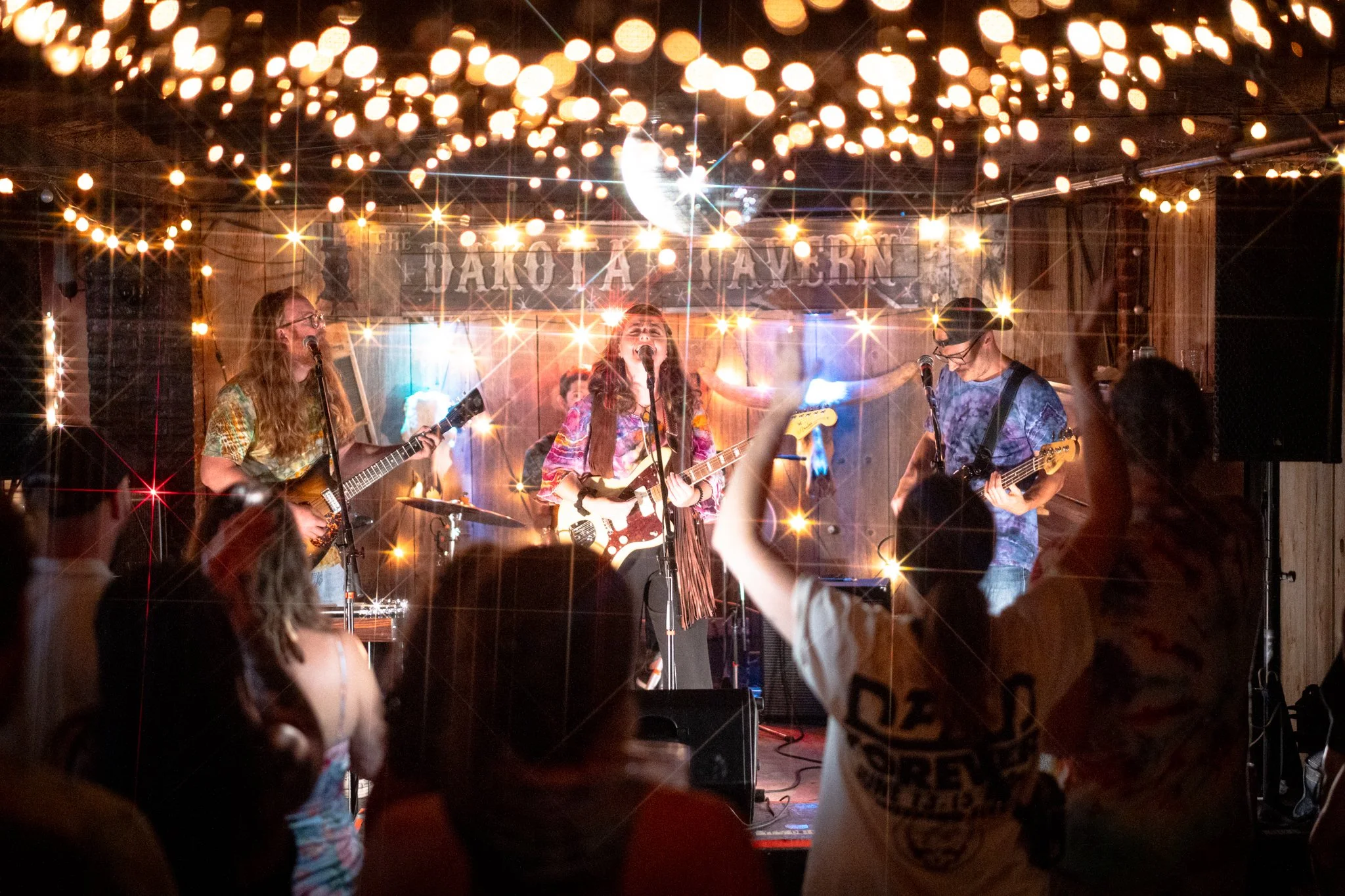 A live band performs on stage at Dakota Tavern with several audience members standing and watching. The ceiling is decorated with string lights and a disco ball reflecting light.