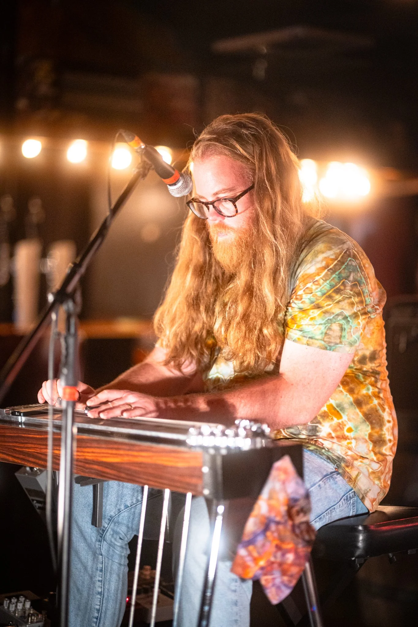 A man with long hair, glasses, and a beard playing a steel guitar on stage with warm lighting.