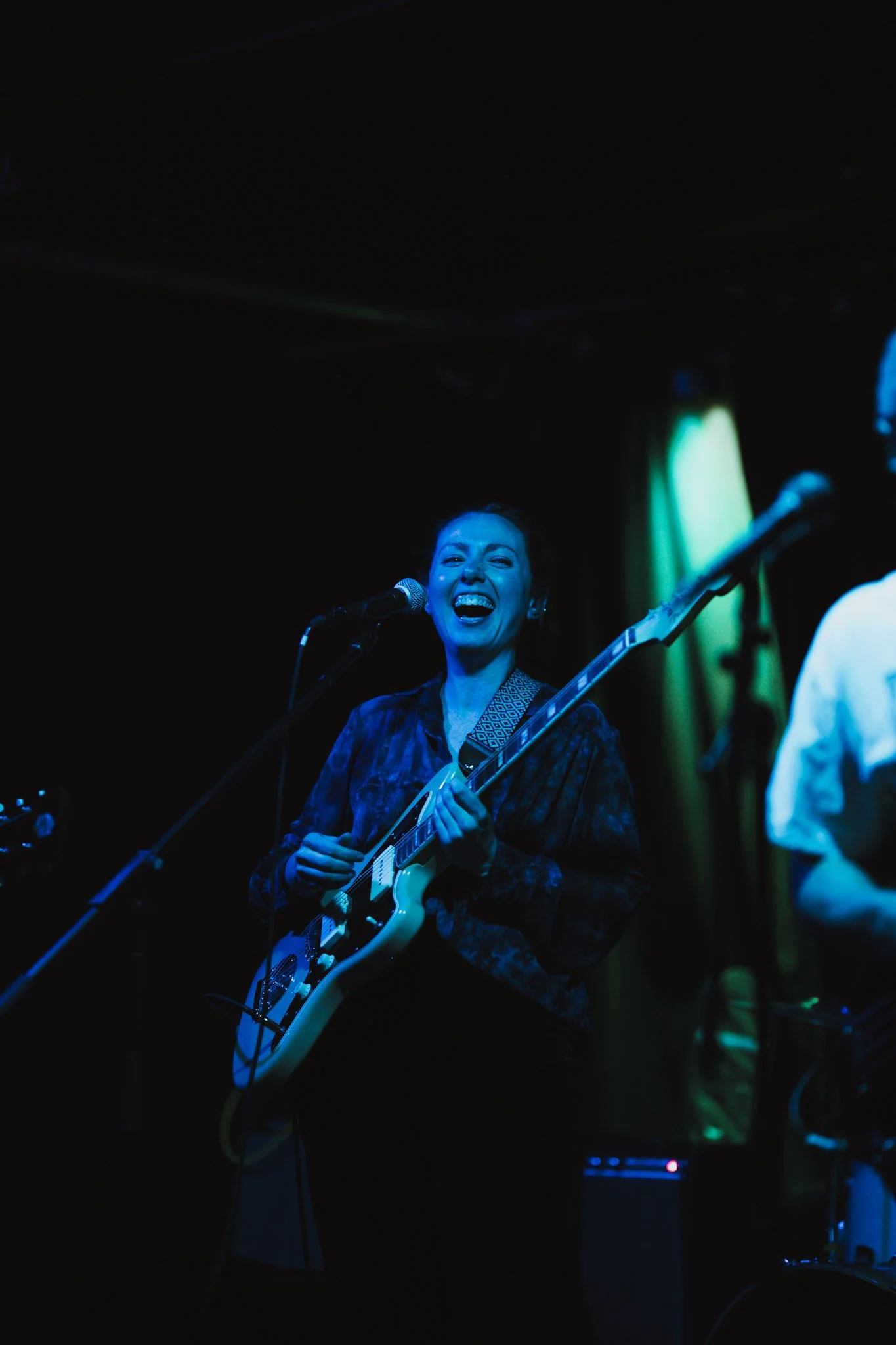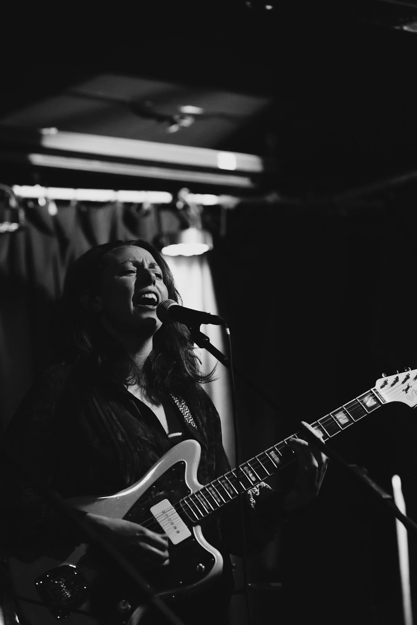 A woman singing passionately while playing an electric guitar on stage, with a microphone in front of her, in a dimly lit venue.