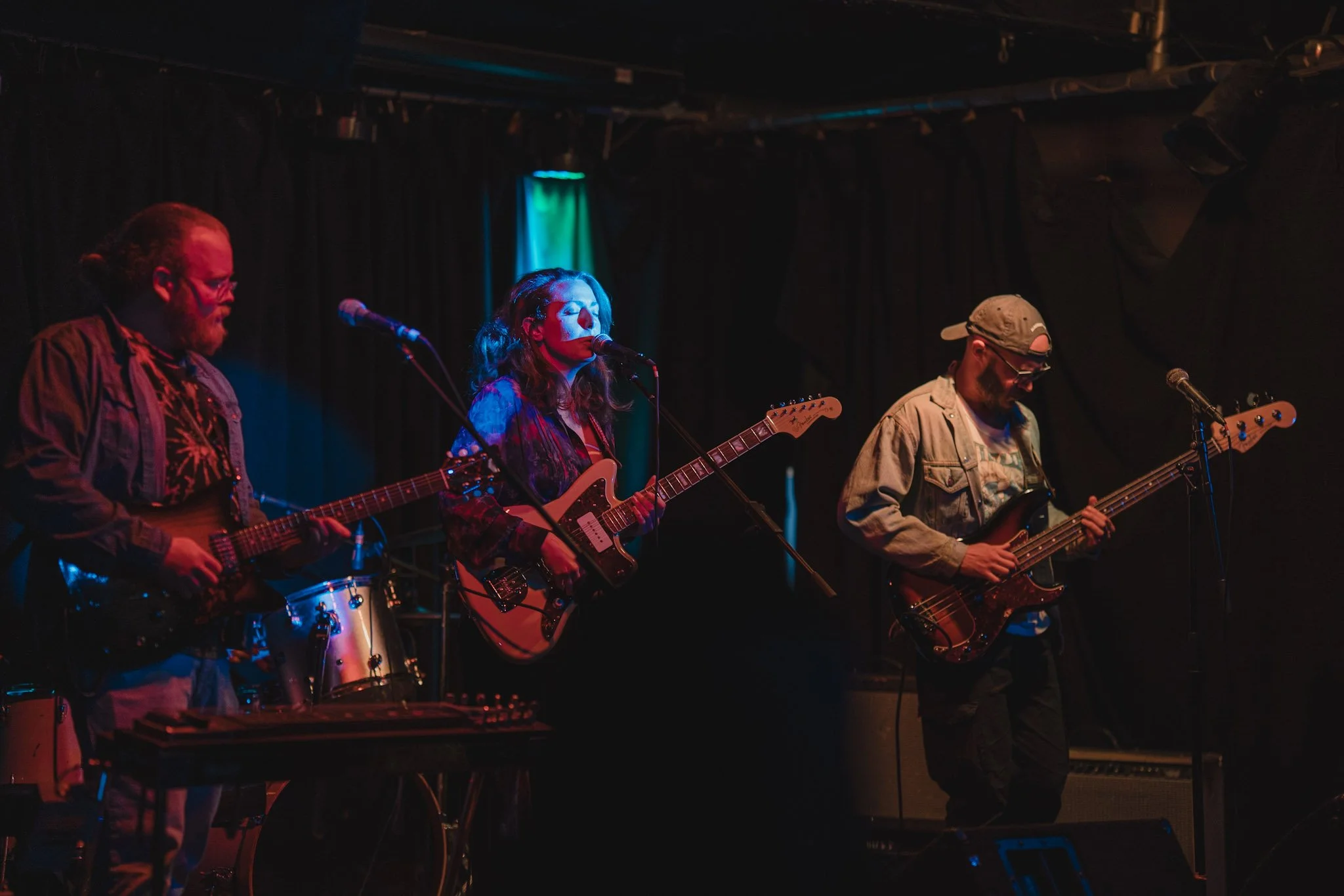 Three musicians performing on stage with guitars and a keyboard in a dimly lit venue.