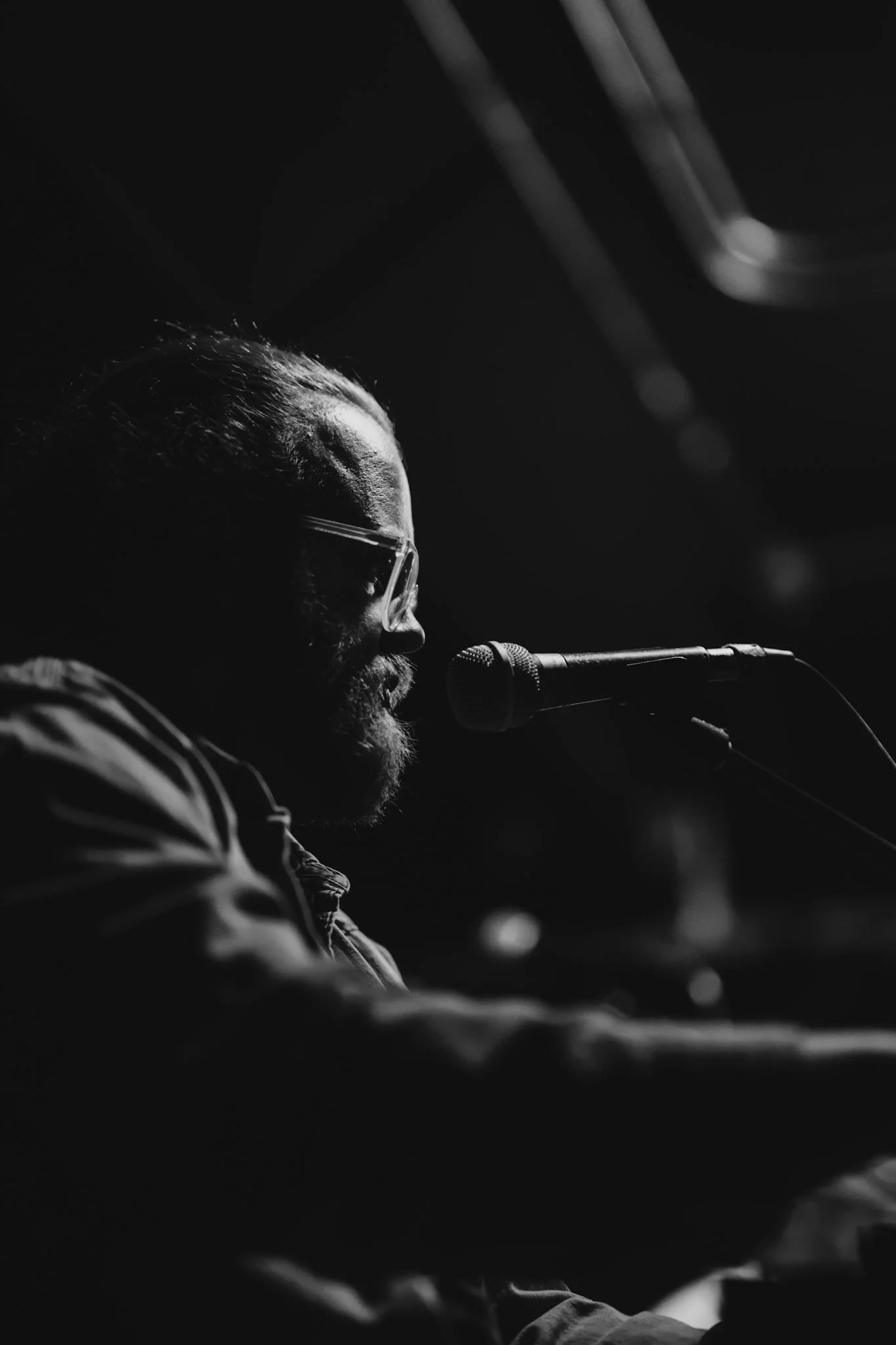 A black and white side profile of a man with glasses speaking into a microphone, with a dark background.