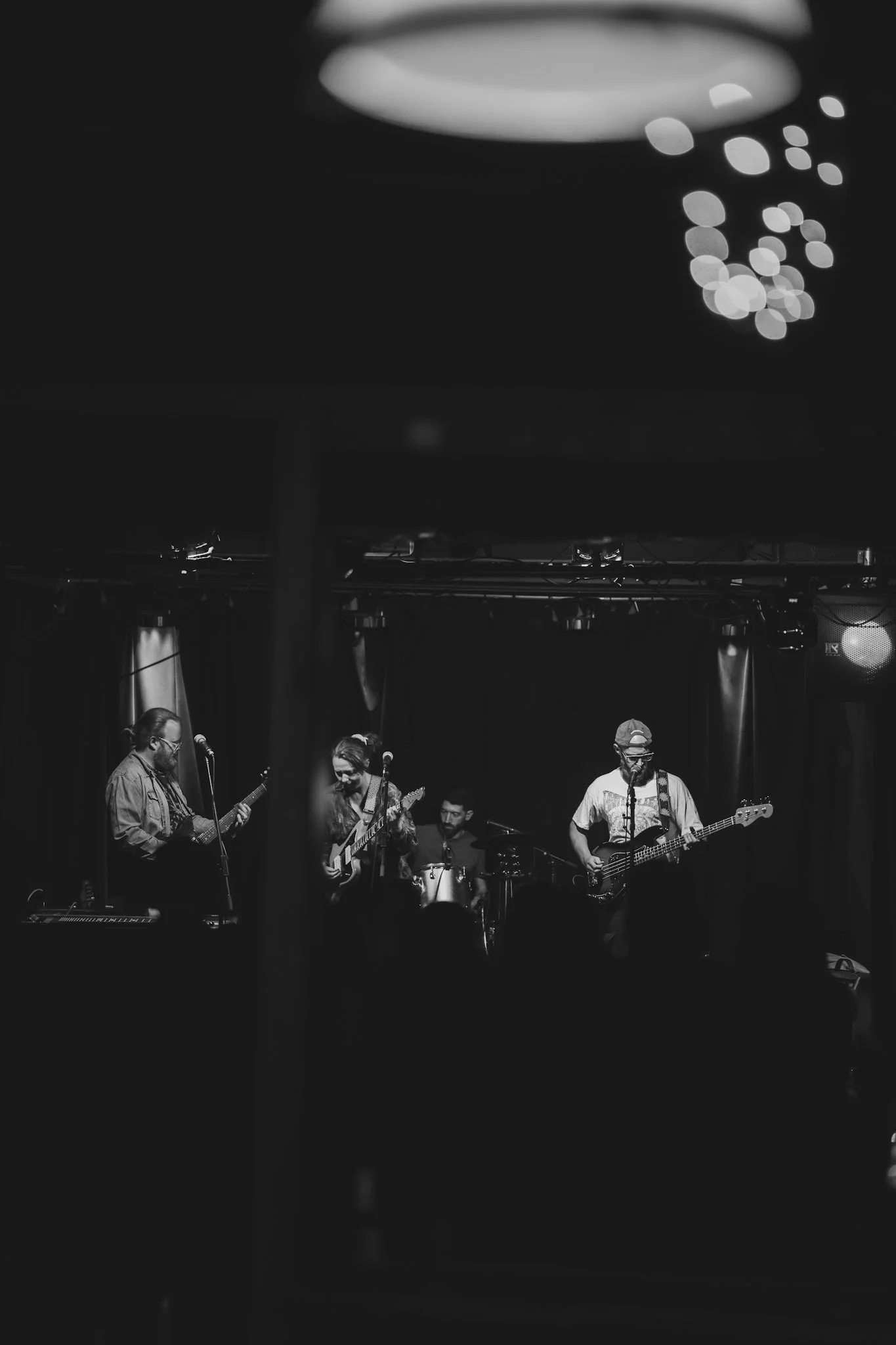 Four musicians performing on stage with guitars and drums, under stage lighting in a black and white photo.