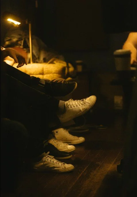 Close-up of multiple people sitting with their legs extended, wearing white sneakers in a dimly lit setting.
