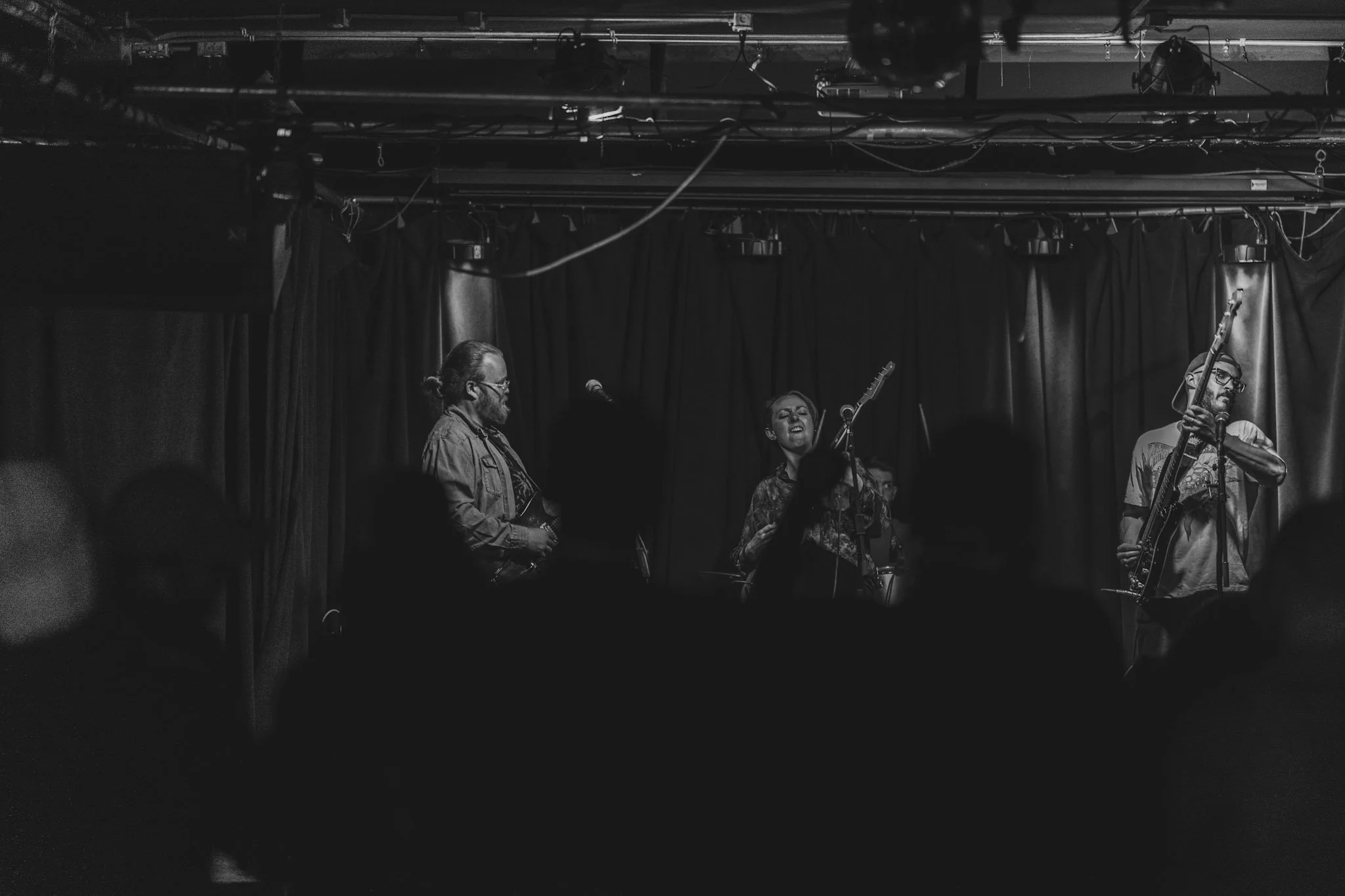 A black and white photo of a live band performing on stage with dark curtains in the background, featuring a female singer holding a guitar, a male with glasses and a cap playing a bass guitar, and another male musician with long hair and glasses.
