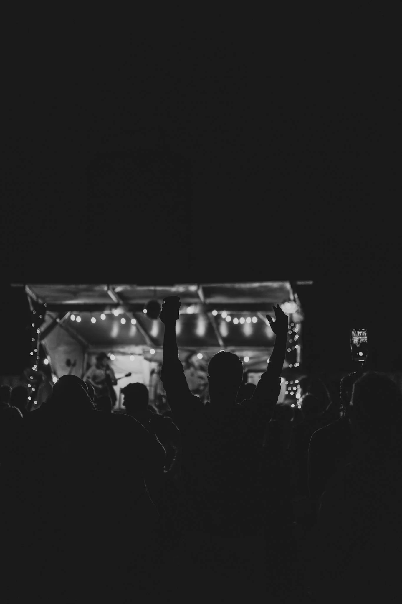 Silhouette of a person raising their hand at an outdoor concert or festival with a stage and string lights in the background at night.