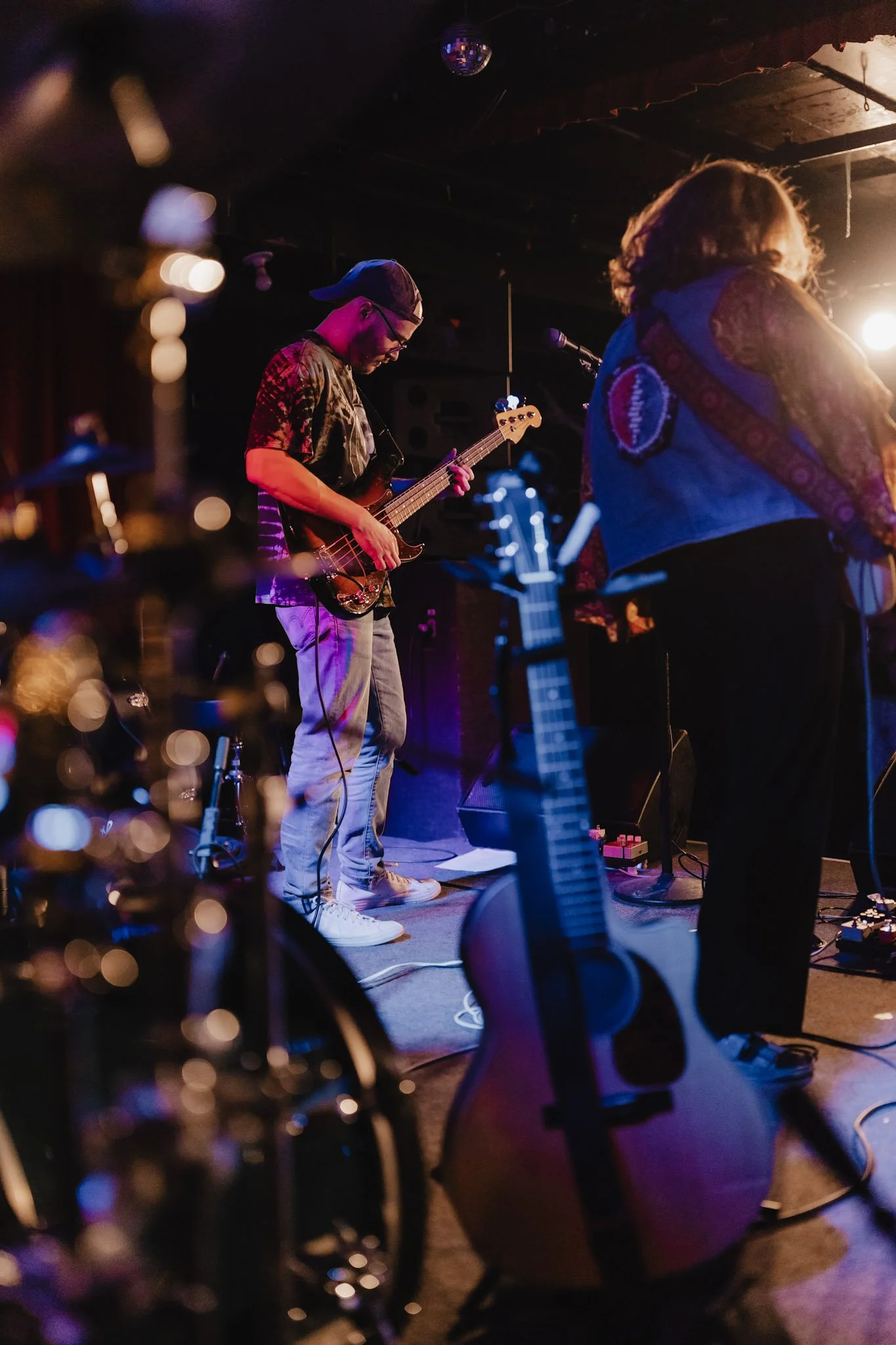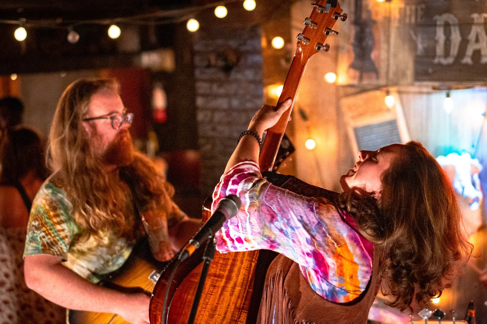 Two women playing guitars and singing at a live music venue with warm lighting and string lights overhead.