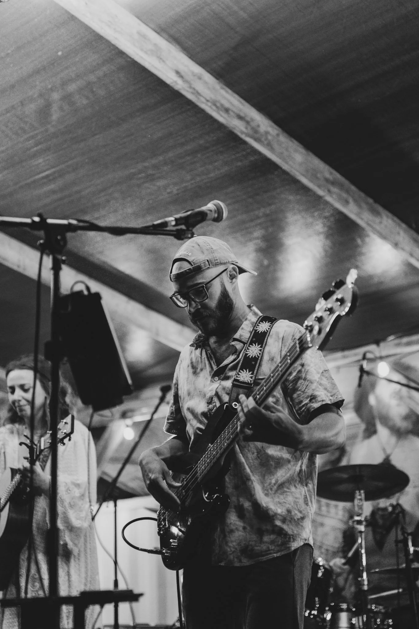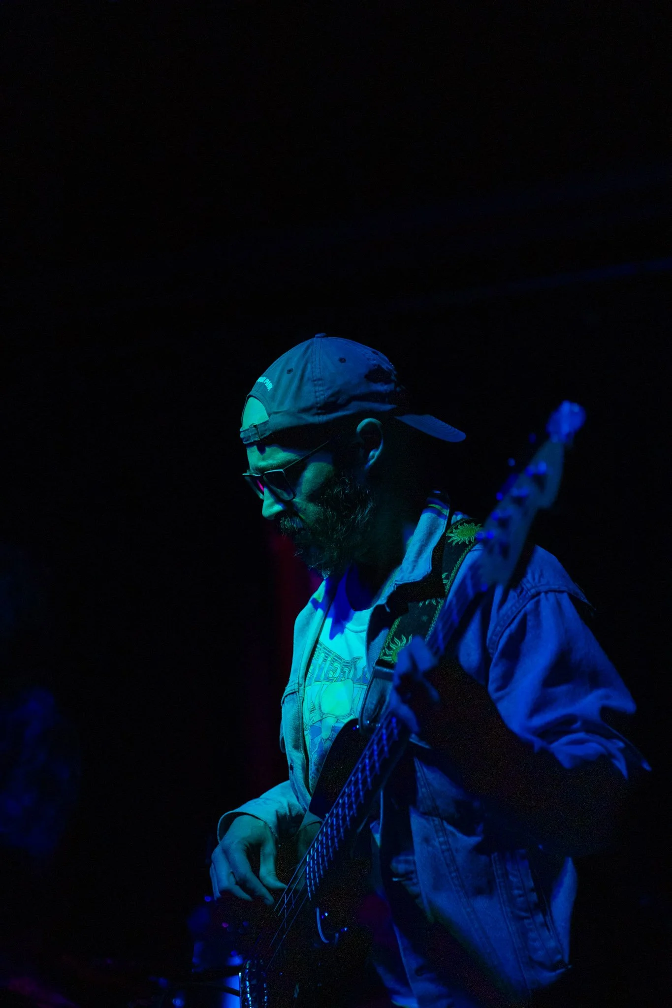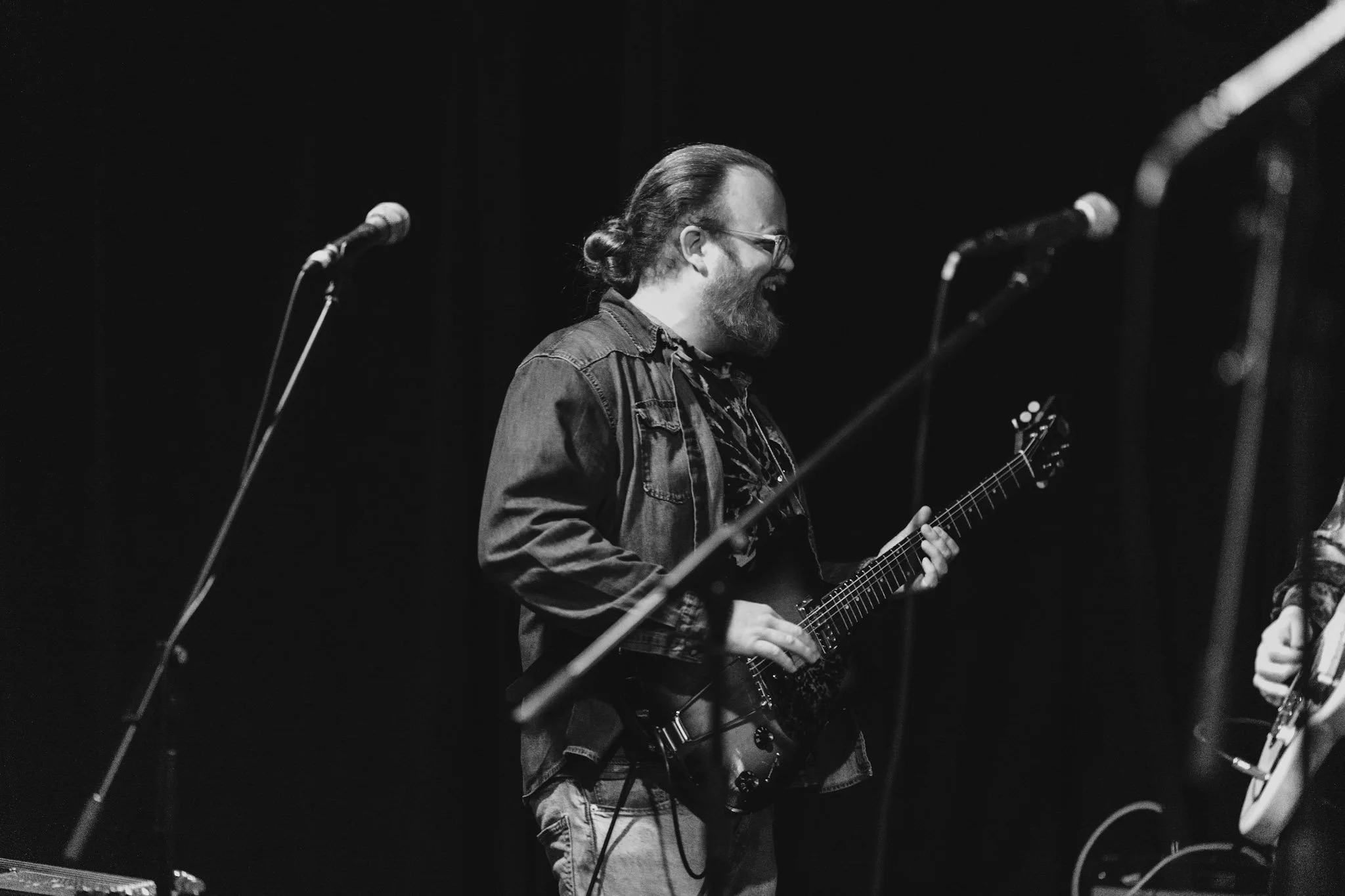 A black-and-white photo of a man with a beard, glasses, and a baseball cap playing an electric guitar on stage, with a woman and drum set in the background.