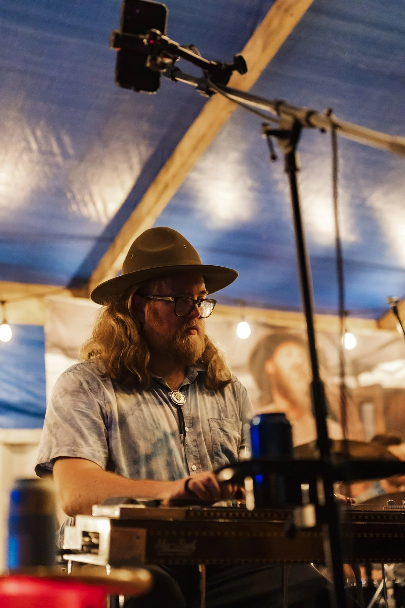 A man with long hair, glasses, a hat, and a bolo tie playing a steel guitar at a music event inside a tent