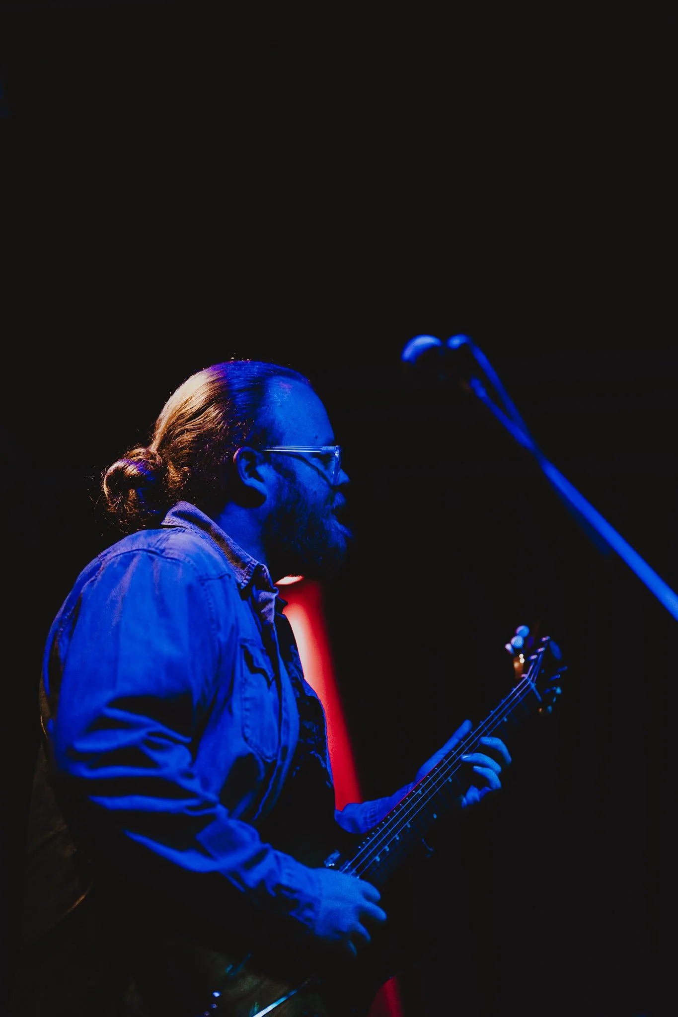 A man with long hair tied back, wearing glasses and a denim jacket, playing an electric guitar on stage with red and blue lighting.