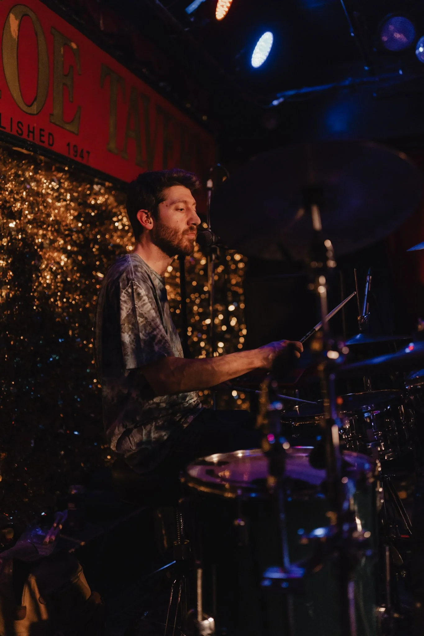 A man playing drums on stage with guitars hanging in the foreground, under warm string lights and a blue tent canopy.