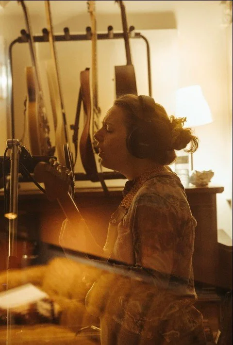 Woman singing with headphones in a home studio, holding a microphone, musical instruments on a rack in the background.
