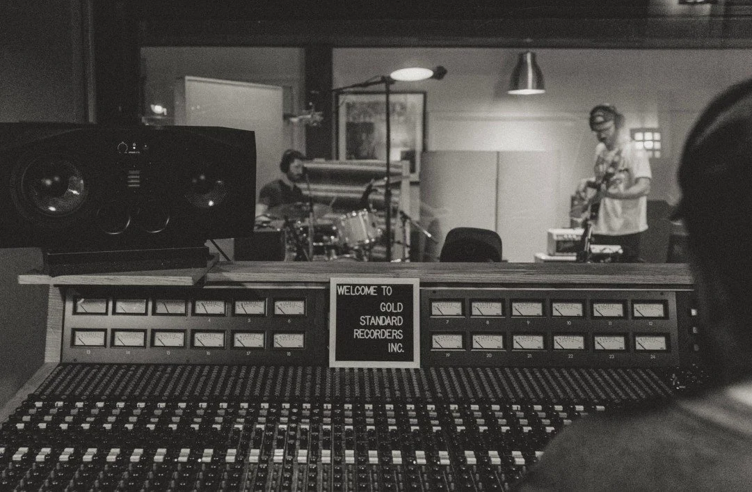 Recording studio with a large mixing console, two musicians playing instruments in the background, and a sign on the console that reads "Welcome to Gold Standard Recorders Inc."