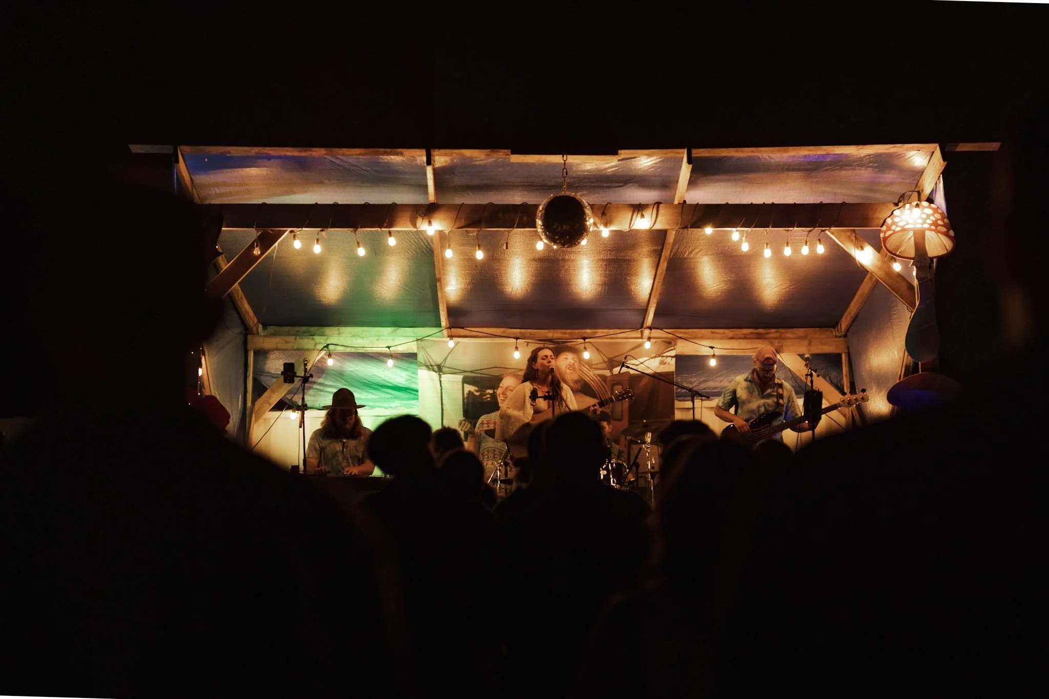Nighttime outdoor concert stage with string lights, musicians performing, audience in foreground, and a decorated wooden canopy.