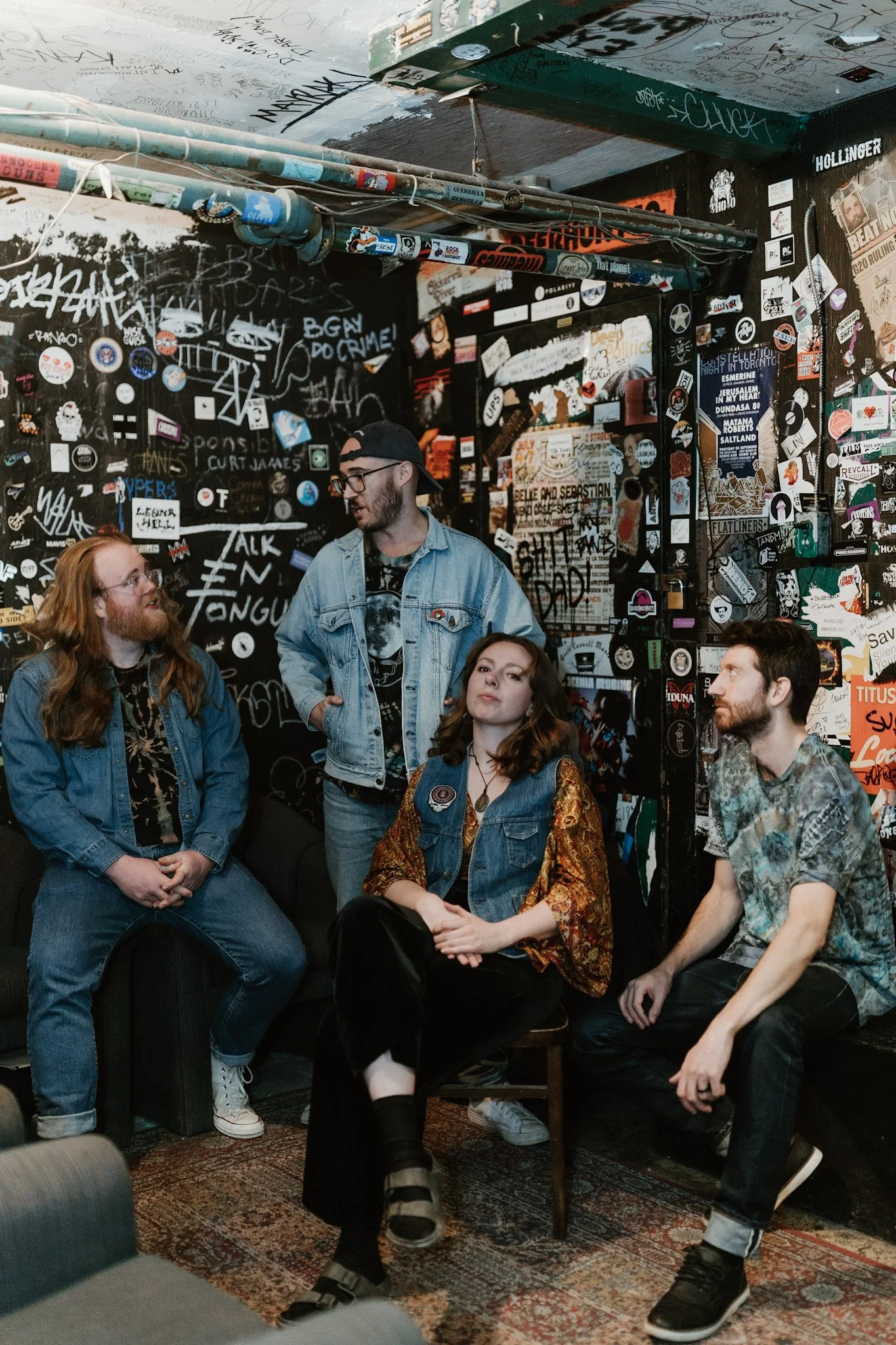 Four young adults in casual clothing gather in a room with black walls covered in graffiti, stickers, and posters. One woman with long hair and a denim vest sits with crossed legs, another woman with glasses and a denim jacket stands, a man with glas