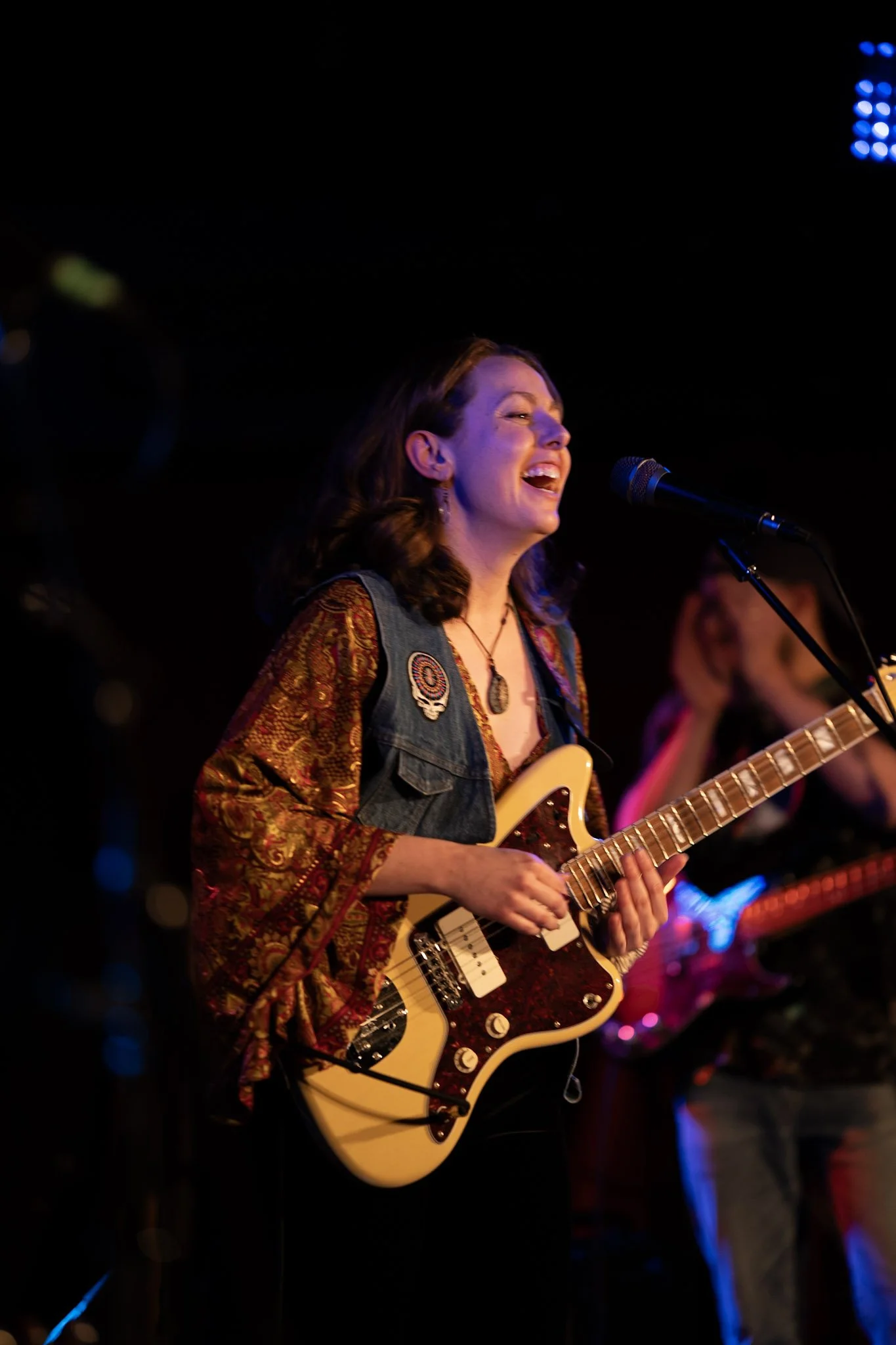 A woman performing on stage with an electric guitar, smiling and singing into a microphone, dressed in a multicolored patterned top and denim vest.