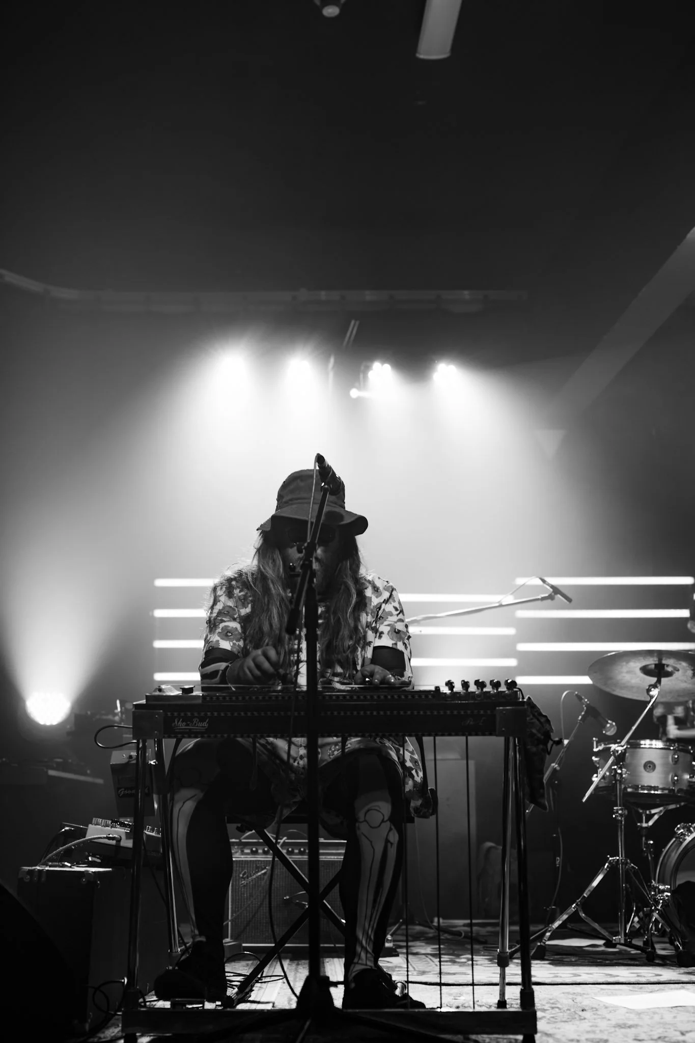 A musician with long hair, wearing a cap and patterned clothing, playing a keyboard on stage with drum set and stage lights in the background.