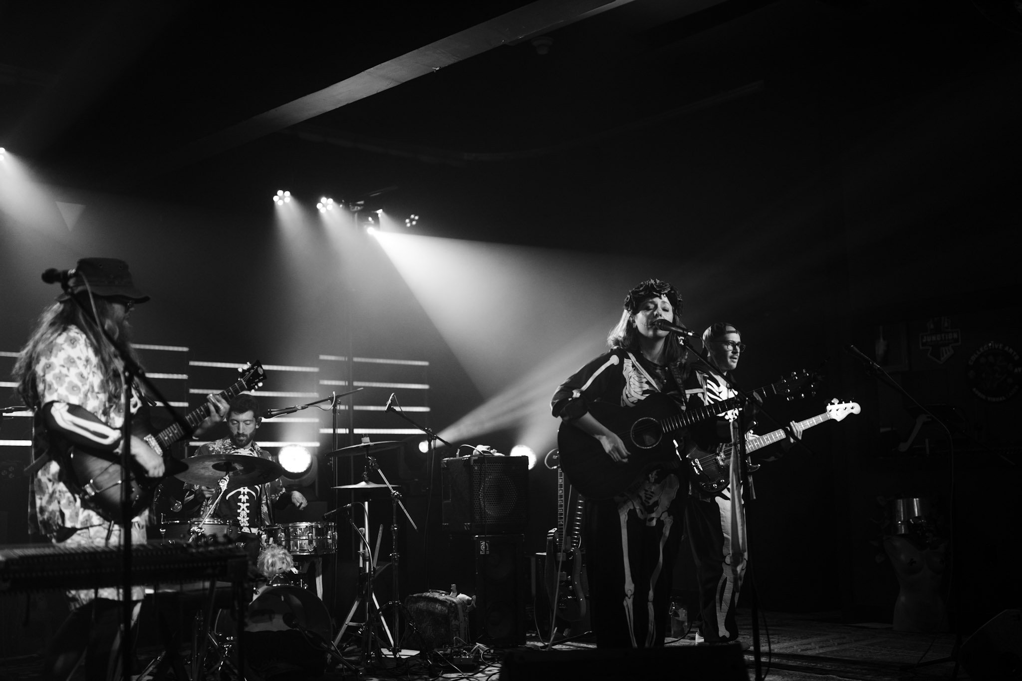 A band performing on stage with colorful lights, featuring musicians in costumes with skeleton and floral patterns, including a woman singing and playing guitar, a man on bass, a man on drums, and another man on guitar.