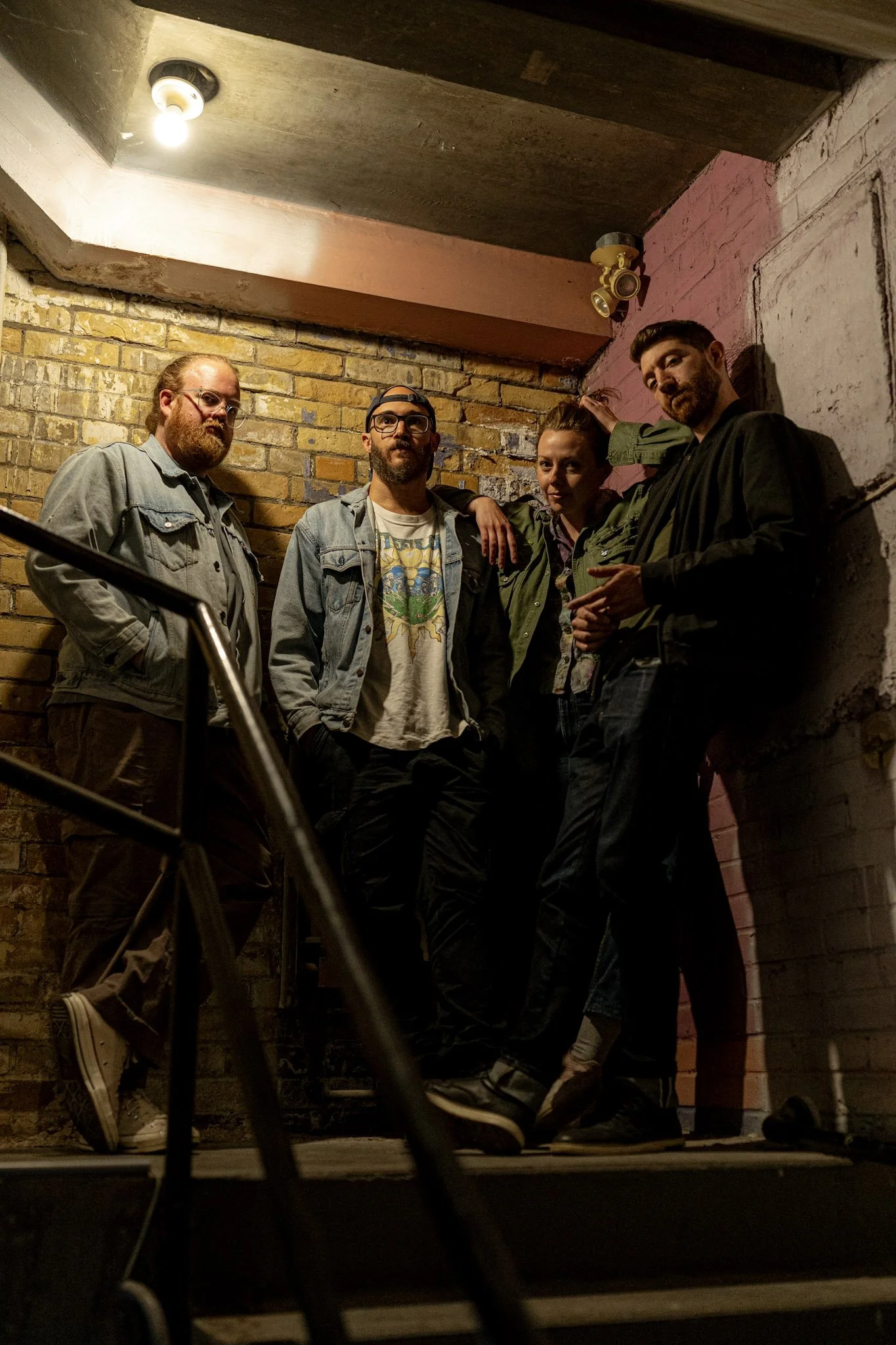 Four people standing on a dimly lit stairway against a brick wall, with one person leaning on the wall and others standing close together.