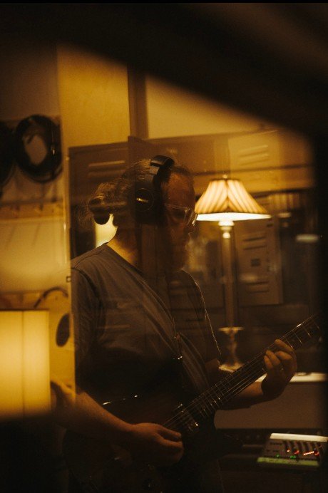 A man with glasses and a beard smiling, wearing headphones and holding a guitar in a dark room