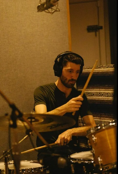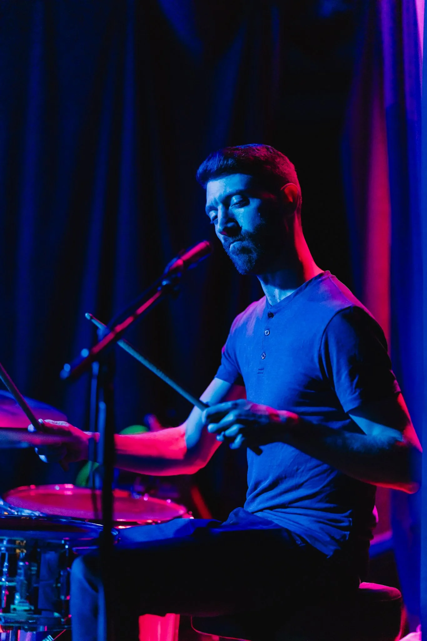 A man is playing drums on stage with colorful lights and a sign reading 'Ode To Tate' in the background.
