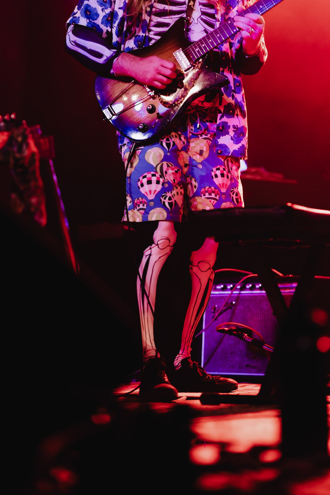 A musician playing an electric guitar on stage, dressed in colorful patterned shorts, skeleton-themed stockings, wearing a floral jacket, with a keyboard and amplifier visible in the background, illuminated by red stage lights.