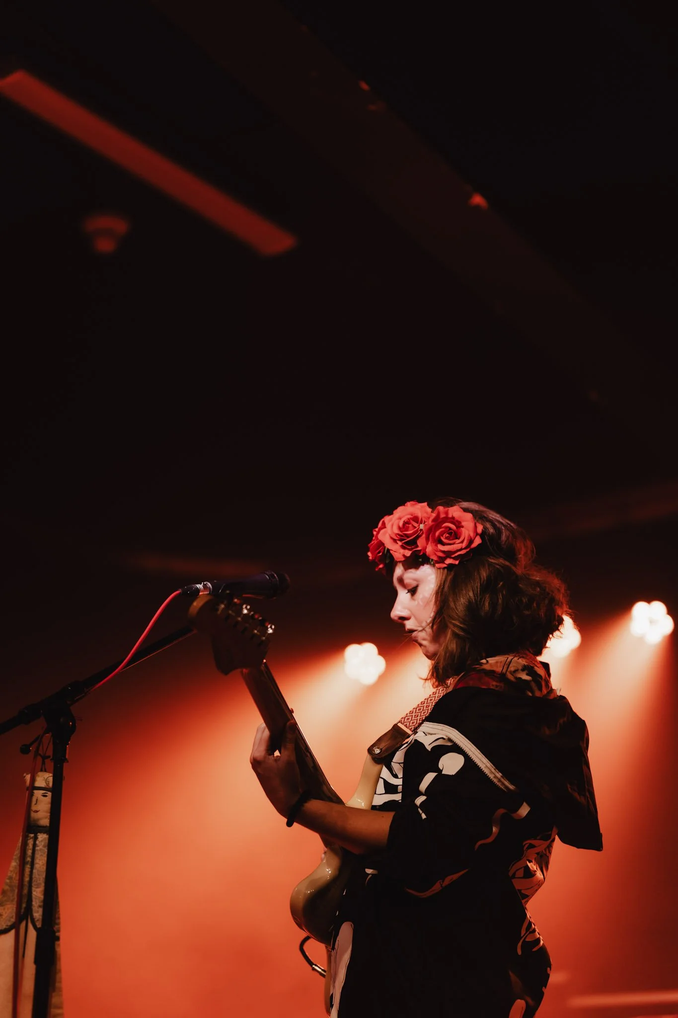 A woman with curly hair wearing a flower crown playing an electric guitar on stage with warm lighting.