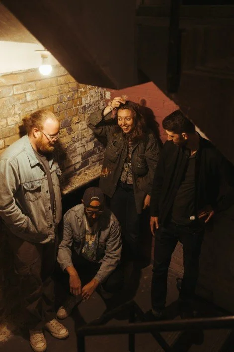 Four musicians performing on a stage with dark curtains: a guitarist on the left, a woman holding a guitar and singing in the center, a drummer in the back, and a man with a guitar and cap on the right.