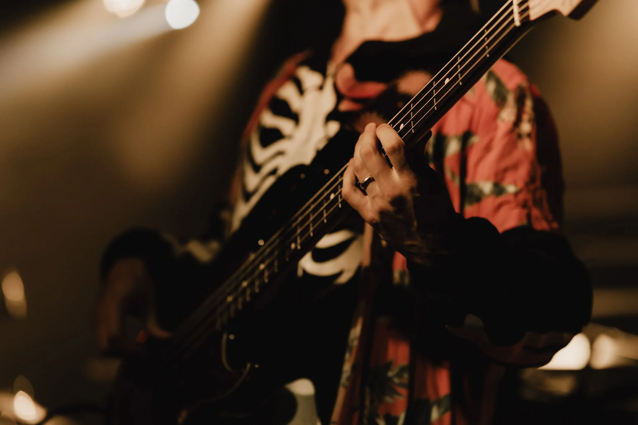 Person playing a guitar in a dimly lit setting, wearing a colorful, patterned shirt with a black hoodie.