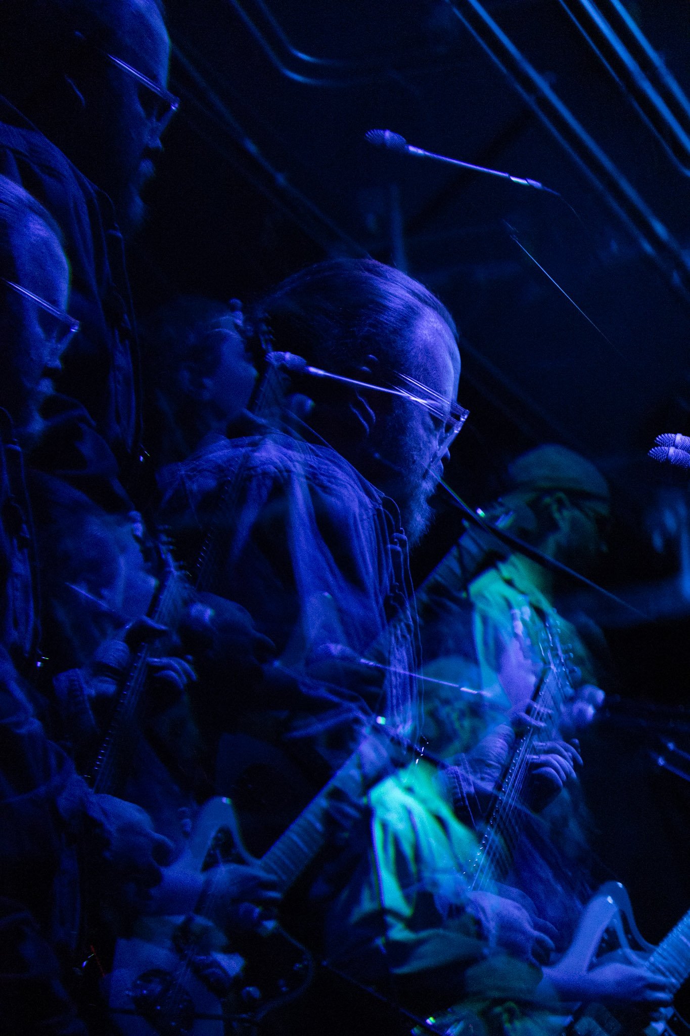 A dark stage with multiple musicians playing guitars, illuminated by blue and green stage lighting, with motion blur effect.
